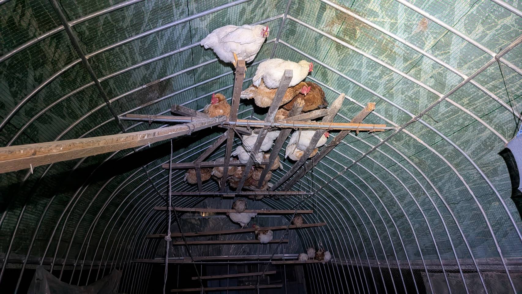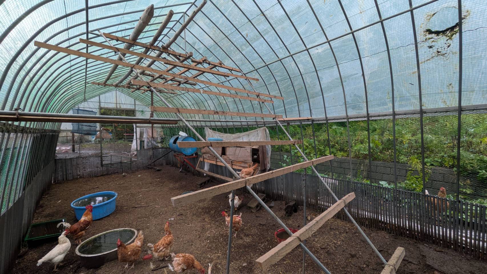 この鶏舎のおかげで、50羽以上の鶏たちが、夏も冬も快適に過ごしています。床に敷き詰めた大量の草は、彼らのベッドであり、遊び場であり、そして糞と共に、やがては土に還り、畑の栄養となります。
