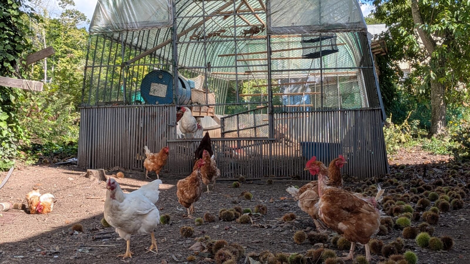 50羽が暮らすメインの鶏舎は、ビニールハウスの骨組みを利用して作りました。
